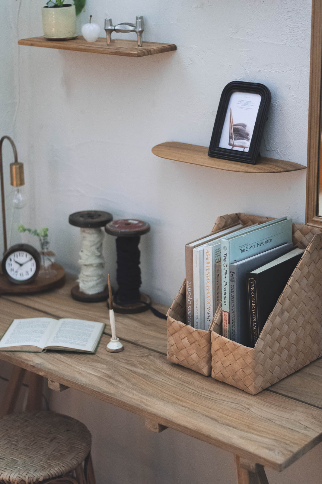 ミラーの下に取り付けて、小さな”パウダースペース”をつくったり。キッチンでコーヒー器具の定位置にしたり。小さな灯りやディフューザーを置いて、ベッドサイドのくつろぎコーナーにも。