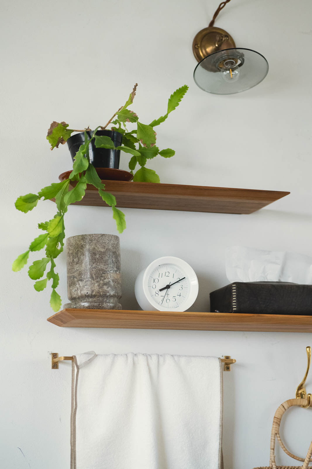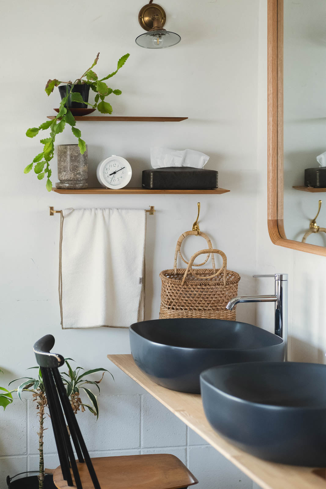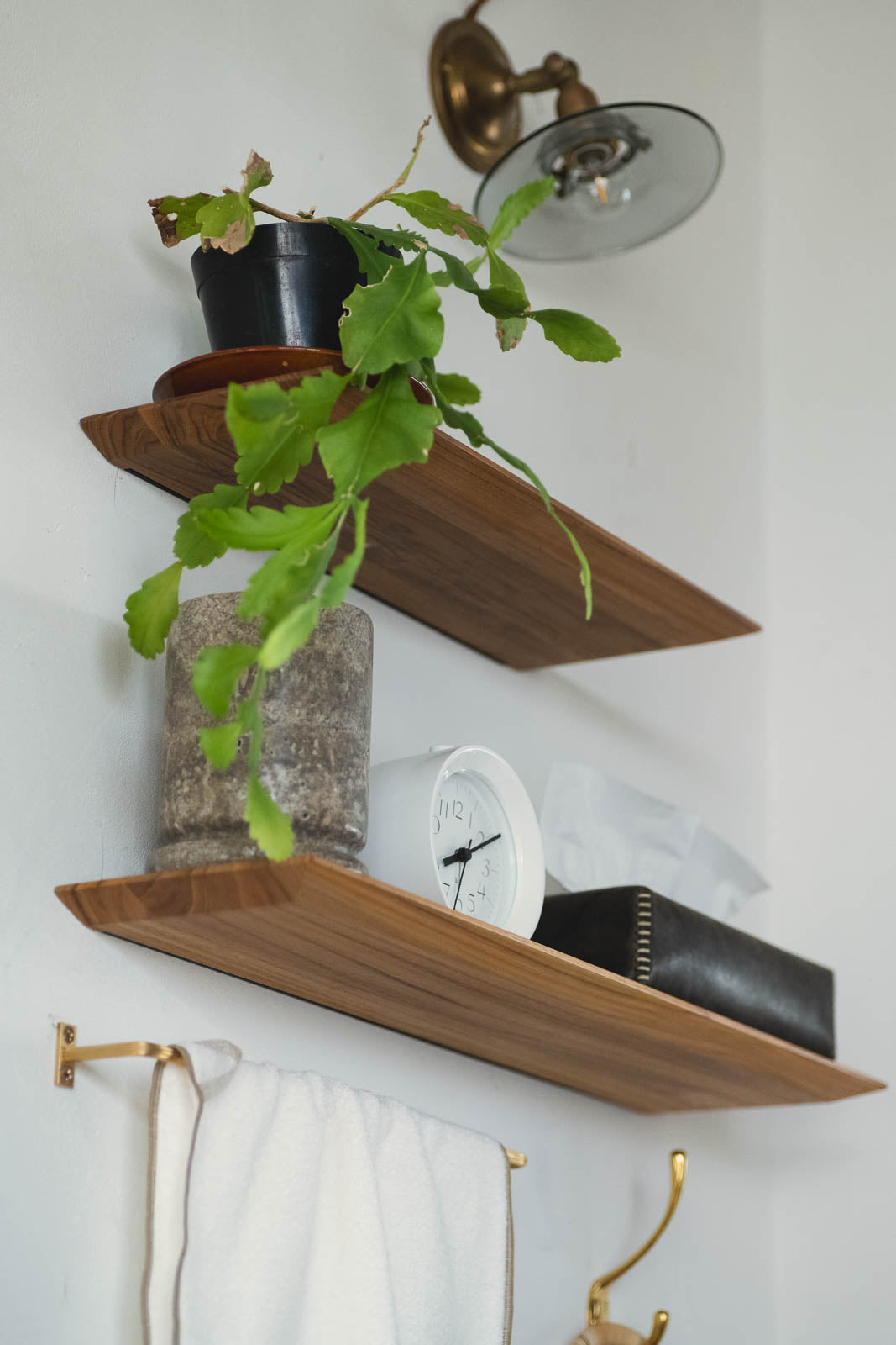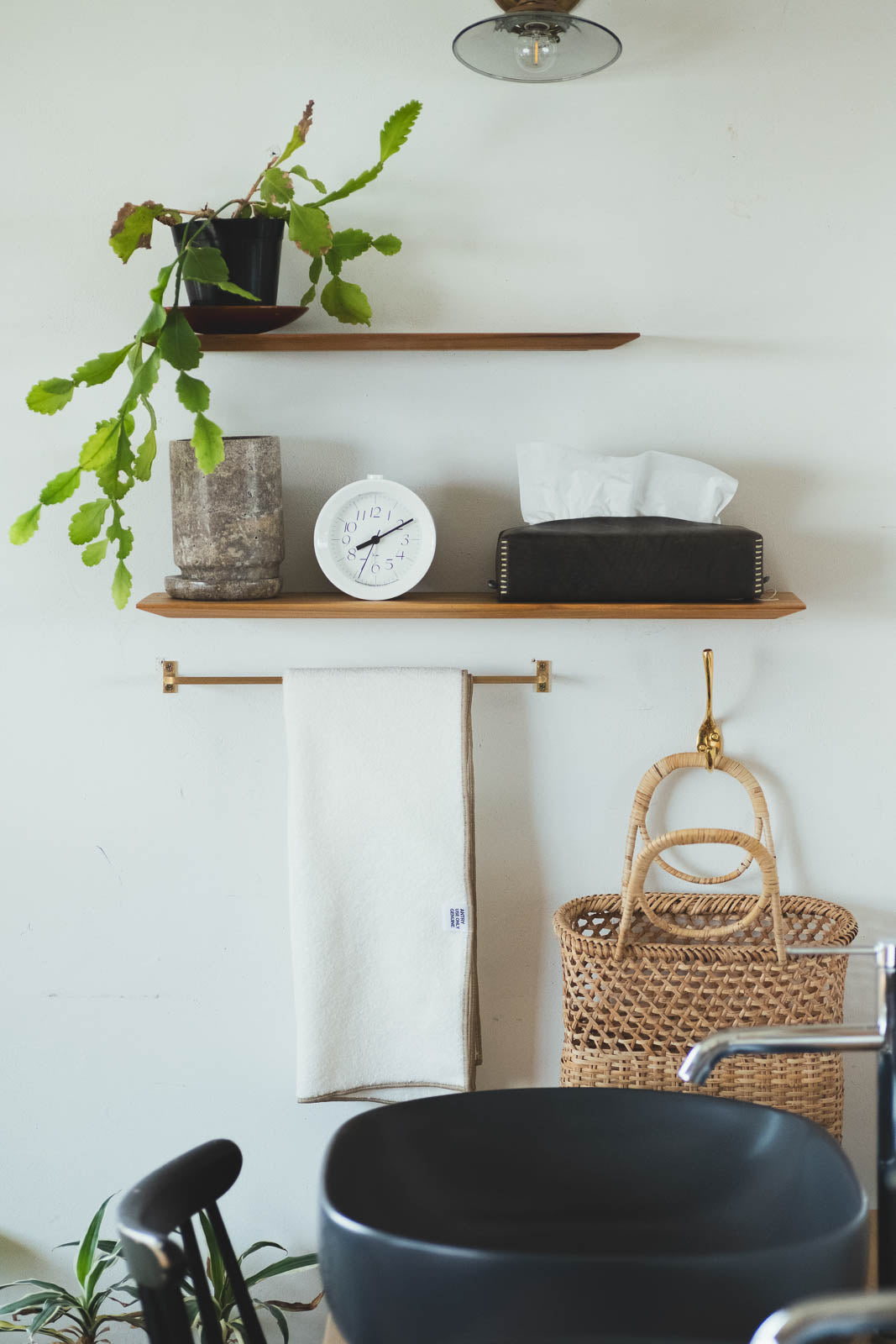 ミラーの下に取り付けて、小さな”パウダースペース”をつくったり。キッチンでコーヒー器具の定位置にしたり。小さな灯りやディフューザーを置いて、ベッドサイドのくつろぎコーナーにも。
