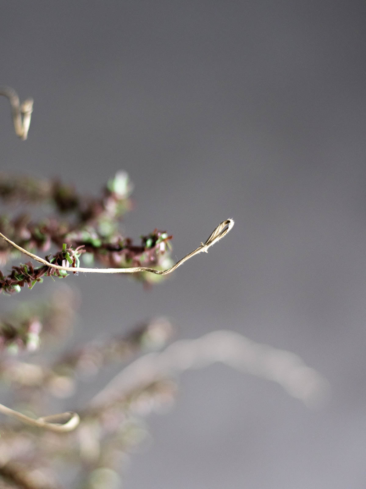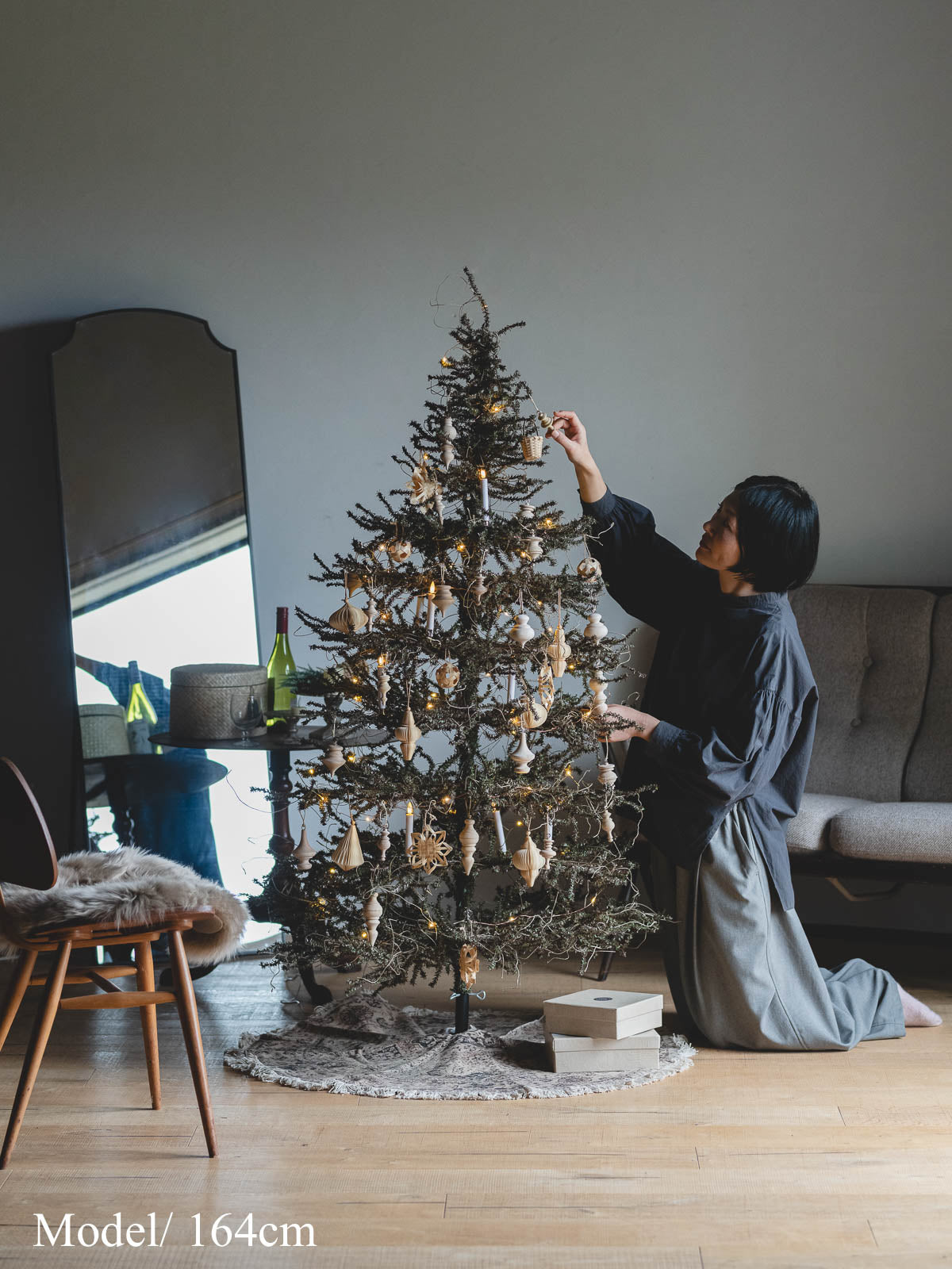 枝葉のくすみがかった深いグリーンカラーや枝葉の自然な隙間は、その厳冬を幾年も越えたモミの木のよう。経年変化で形を変えてきた風合いを表現し、オーガニックでリアルな姿が魅力です。枯れ葉を表現したようなワイヤークラフトもよいアクセントに。