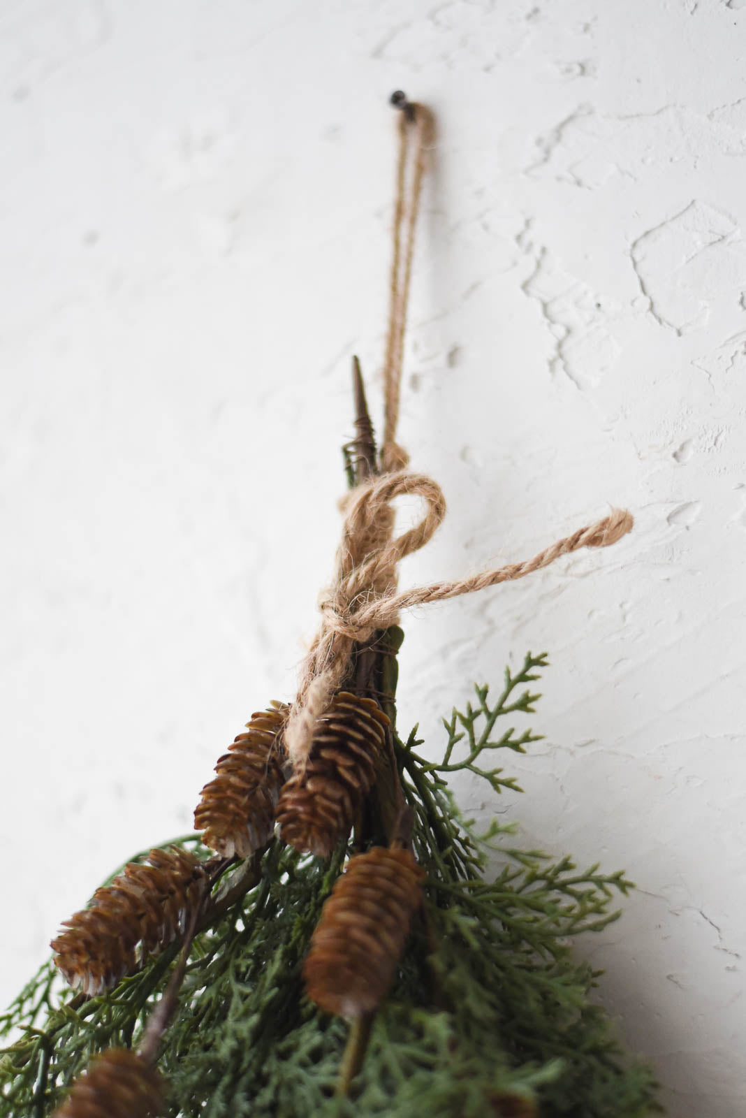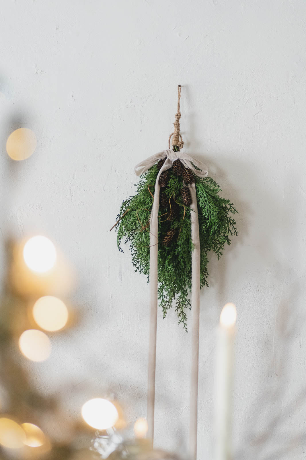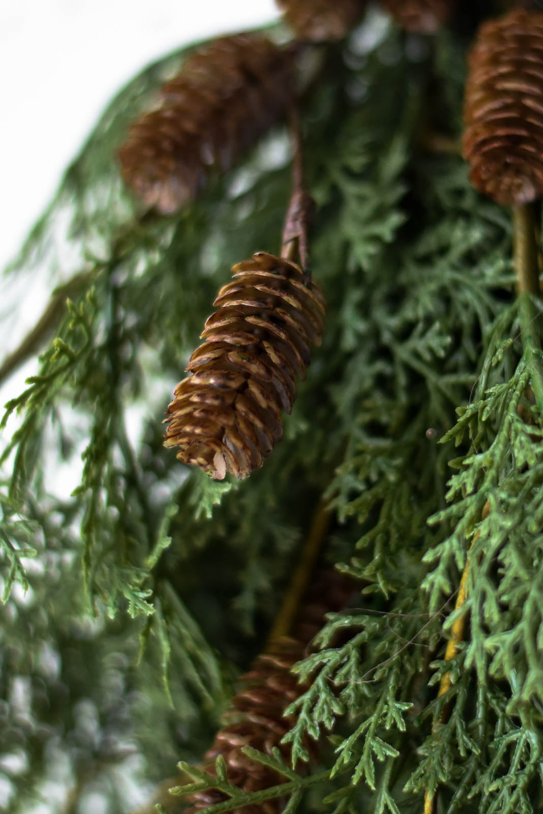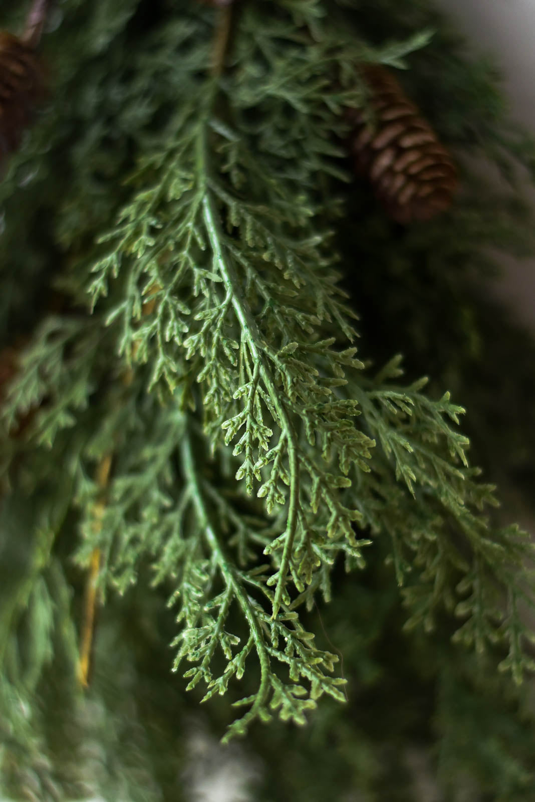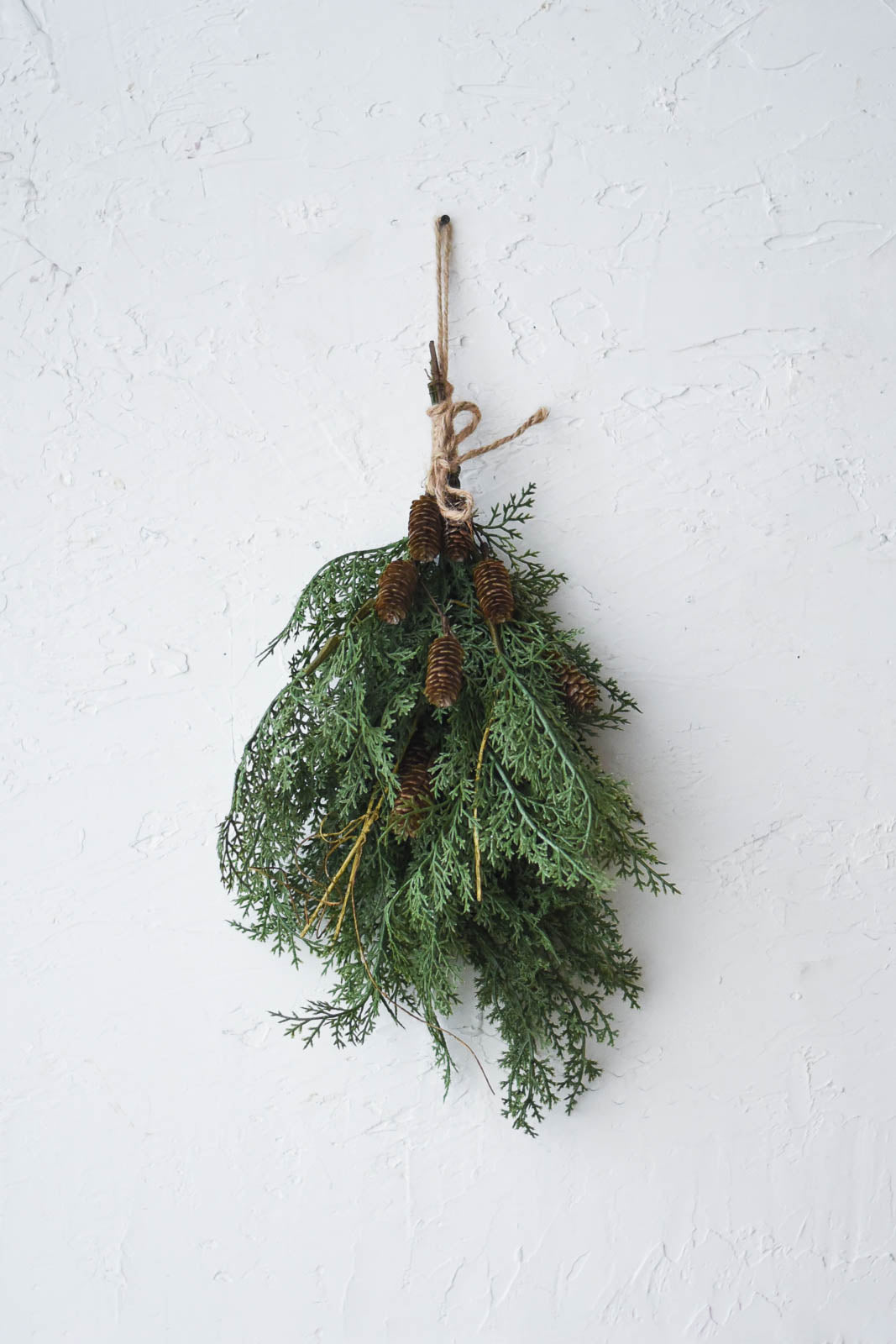 繊細な葉と小さな松かさが重なり合い、まるで森から届いた贈り物のような「Whispering(ウィスパリング)スワッグ」。壁やドアに吊るすだけで、空間にナチュラルな温もりとほんのりとしたホリデームードを添えてくれます。